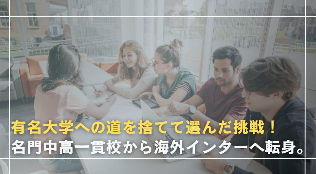 A: 中学受験を経て、みんなが憧れる中高一貫校に入学したので、ストレートに有名大学に進める道が約束されていました。学校生活は楽しく、素晴らしい友人にも恵まれていましたが、授業は少し堅苦しく感じていました。伝統と歴史のある学校だったため、平均的に全部ある程度出来るようになりなさい。エリートサラリーマンを育てるような教えでした。答えが合っていても、途中の式が正しくないという理由でテストの答案がバツになったこともありました。そういう自分では納得できないことが続いていく中で、環境を変えたいなと思うようになりました。中学3年生のときに海外のインターナショナルスクールに挑戦することを決めました。